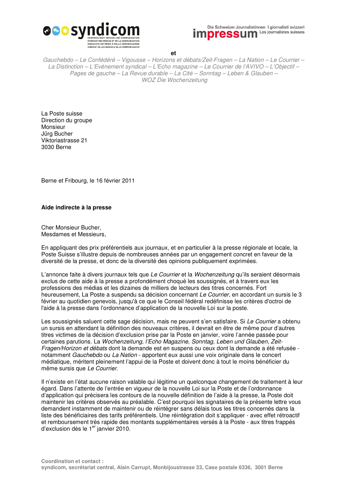 « Les décisions prises ces 12 derniers mois par la Poste d’exclure certains titres de l’aide indirecte à la presse sont d’autant plus inadmissible que la législation postale, qui définit cette aide, était en plein processus de révision », soulignent les signataires dans un communiqué diffusé le 16 février 2011. La Poste semble s’en être rendu compte, puisqu’elle a fait une première volte-face en accordant un sursis au « Courrier« de Genève. Les signataires de la lettre ouverte exigent que la Poste, en toute logique, accorde le même sursis à tous les autres titres concernés, dans l’attente de l’entrée en vigueur de la nouvelle loi et de l’ordonnance, vraisemblablement au 1er janvier 2012.