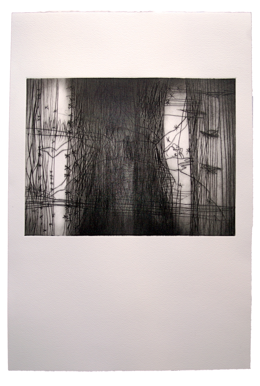 « De Madrid al cielo (el ángel caído)« . Allusion à sa propre situation, mais aussi à celle des jeunes espagnols. Une pointe d’optimisme, dans ce mur et ces barbelés, on devine une sorte d’ailes. Gravure de Carol Juillet