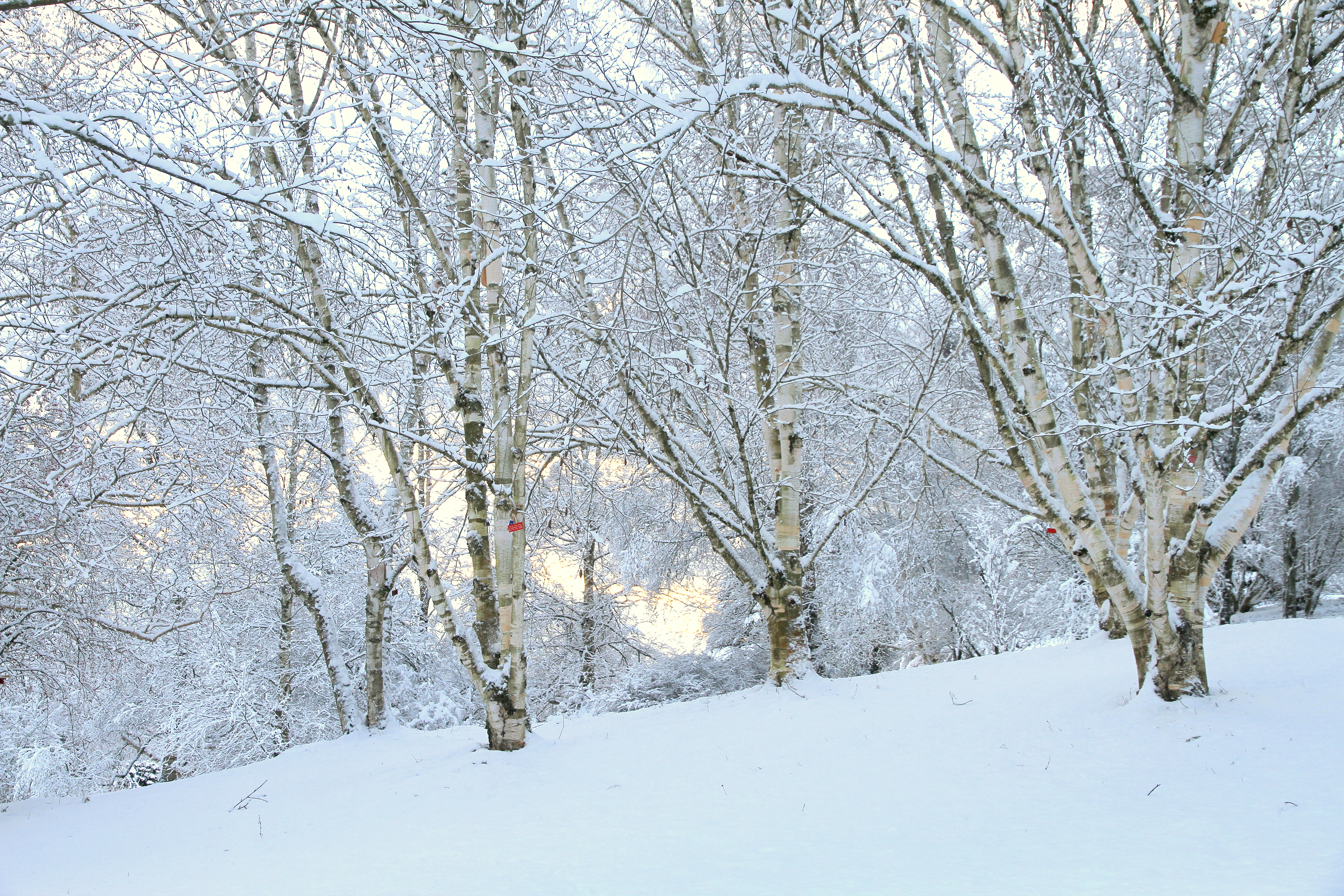 Des plages plus sombres oscellent le paysage. Proche du centre de gestion l’étang sommeille encore dans le silence cristallin d’une bise insidieuse qui gèle tout. Les grands séquoiadendron, témoins des premiers âges, qui gesticulent en trio près de Centre, se sont drapés dans leurs branches et attendent le printemps pour reprendre leurs palabres. De leur côté, les bouleaux à la peau soyeuse, plus blanche que la neige qui s’en va, jettent vers le ciel clair la résille de leurs rameaux qui découpent la transparence à l’encre des contre-jours !