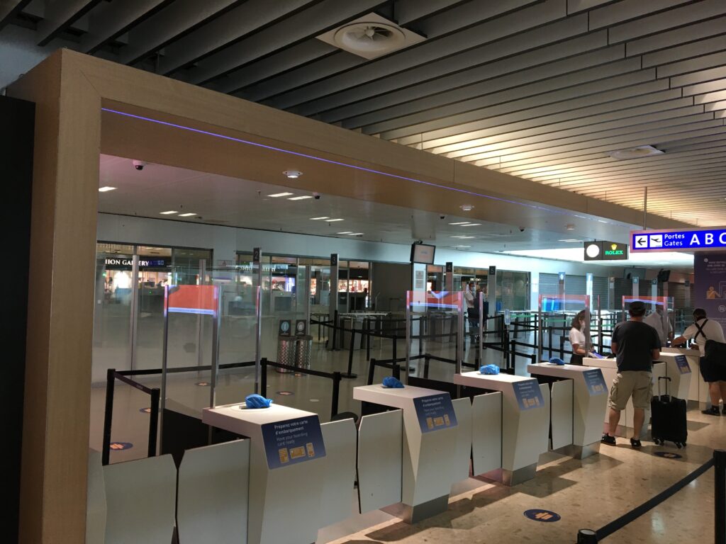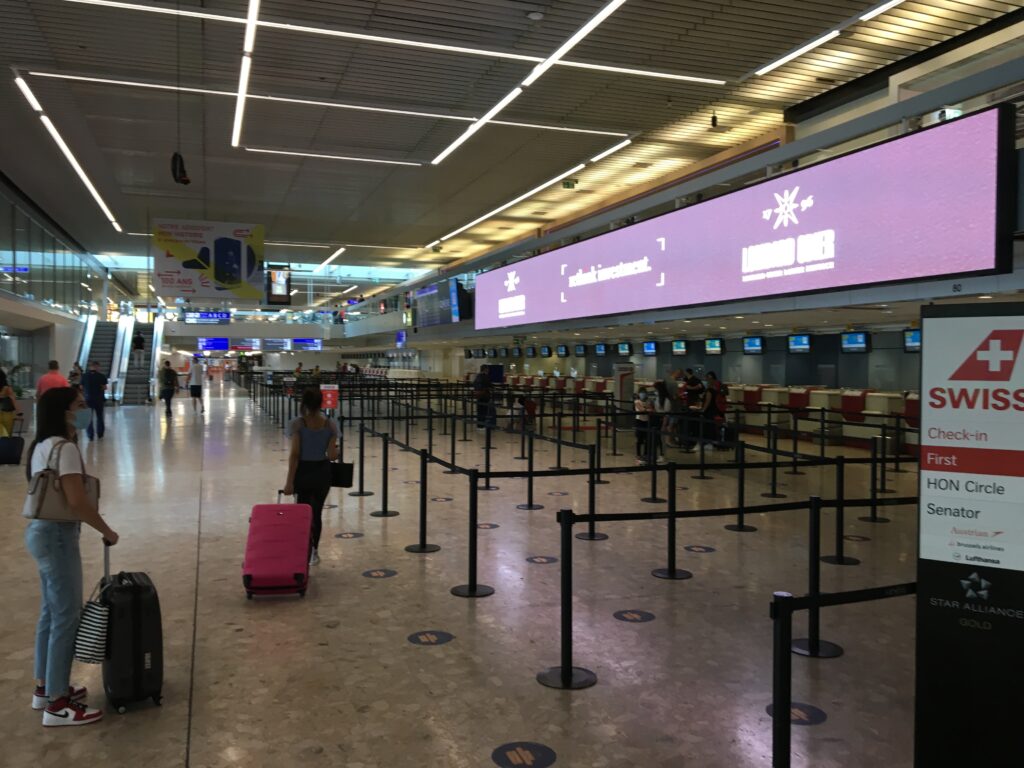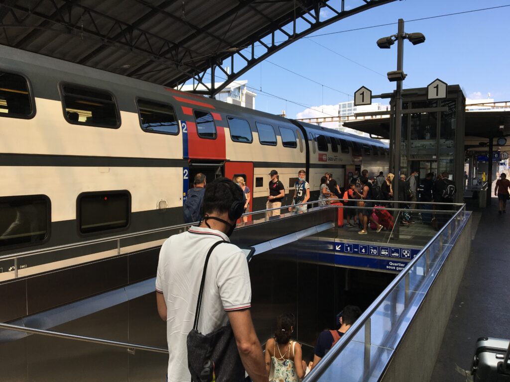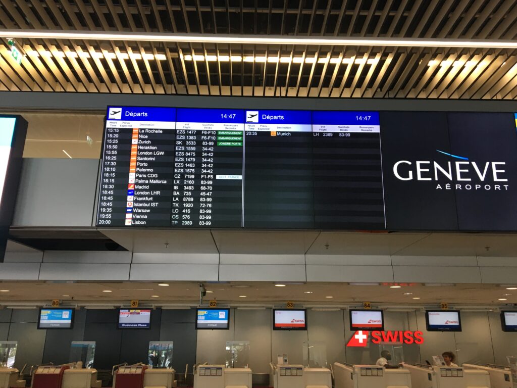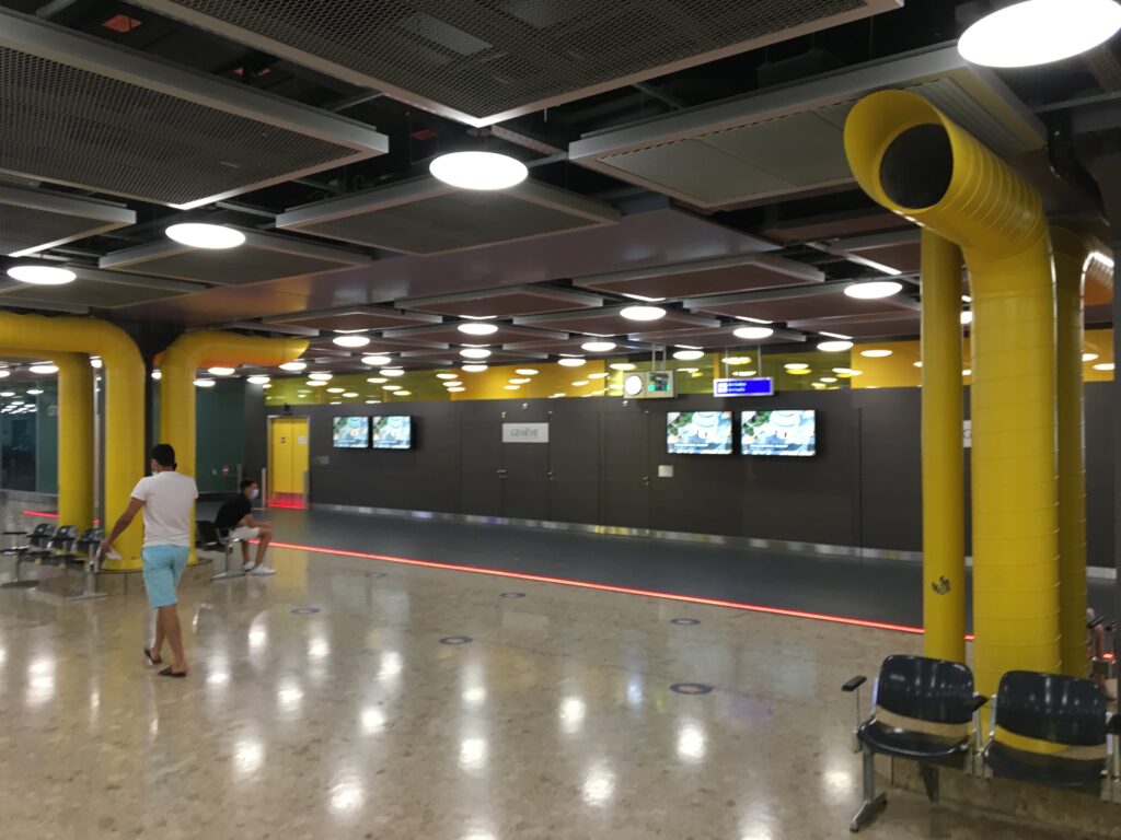 L’intérieur du Léman Express. Propre en ordre mais peu de monde en ce jour de canicule. Photo le Médusé, 30 juillet 2020.La nouvelle gare d’Annemasse, une localité en plein boom, en attestent les lieux de restauration bondés au centre. Photo le Médusé, 30 juillet 2020.Aéroport de Genève-Cointrin. Ce n’est pas la foule des grands jours et pourtant on est en pleines vacances estivales. Photo le Médusé, 30 juillet 2020.Le monde réduit à quelques lieux de villégiature européens. Photo le Médusé, 30 juillet 2020.Calme plat à l’embarquement… Photo le Médusé, 30 juillet 2020.Un peu plus d’animation chez Easyjet. Suffisant pour sauver la mise? Photo la Méduse, 30 juillet 2020.Contrôle des bagages, on se tourne les pouces… Photo le Médusé, 30 juillet 2020.Vous attendez quelqu’un? Photo le Médusé, 30 juillet 2020.Gare de Lausanne, ah, la terre est quand même peuplée! Photo le Médusé, 30 juillet 2020.
