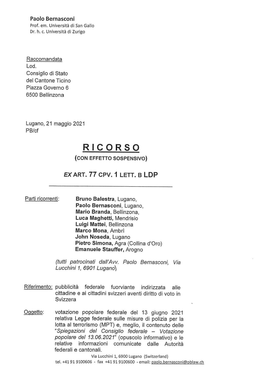 Neuf anciens ténors du barreau tessinois emmenés par l’ancien procureur Paolo Bernasconi ont adressé un recours au Conseil d’Etat tessinois contre le projet de loi fédérale sur les mesures policières de lutte contre le terrorisme (MPT) qui sera soumis au vote populaire le 13 juin 2021. « La procédure de votation et d’information de la population souffre d’irrégularités flagrantes », soulignent les signataires qui rejoignent ainsi d’autres magistrats déterminés à s’opposer à la MPT dans les cantons de Zurich, Lucerne et d’Obwald.