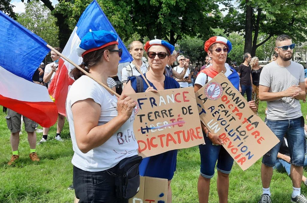 Ce que tous redoutent : le risque considérable d’atteintes aux libertés individuelles, garanties par la Constitution, que le président marcheur fait planer sous prétexte de vouloir éradiquer le virus. « Ce pass sanitaire est une souillure sur notre drapeau bleu blanc rouge », a tonné Florian Philippot sur une estrade autour de laquelle se massait une foule immense dont les autorités ont – évidemment ! – sous estimé le nombre (4.000 personnes, en réalité certainement 20.000). Et c’est là où les défenseurs du gouvernement pourraient accuser M. Philippot de fomenter une sorte de sédition s’ils voulaient aller jusqu’au bout de leur stratégie. Sur des pancartes, on pouvait lire des slogans très cash : « Révolution », « Insurrection », « A bas la dictature », etc.