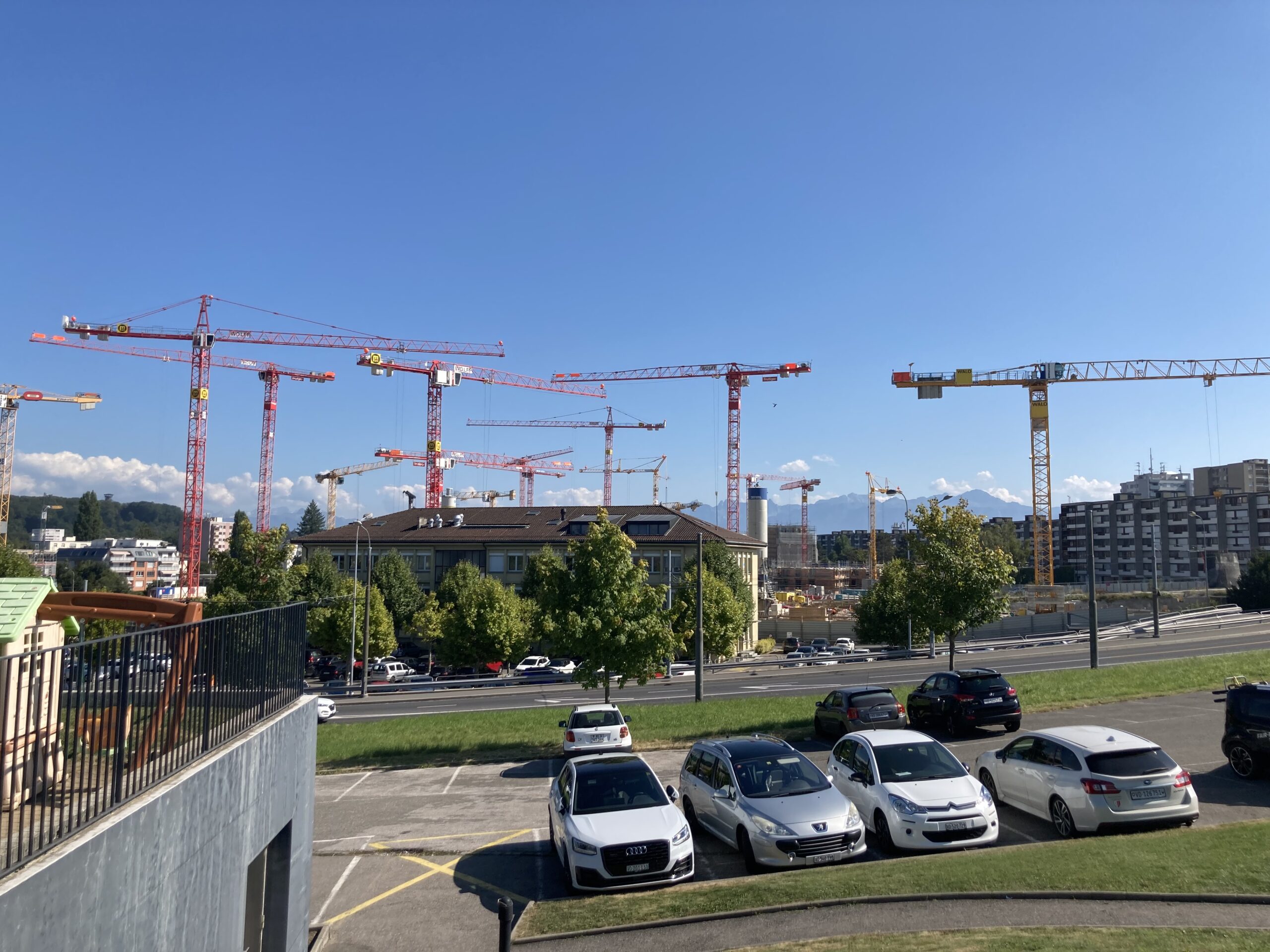 La réglementation sur le seuil des niveaux sonores admis par l’OFAC dans le Cadastre du bruit ne prend en compte que l’environnement immédiat de l’aérodrome régional. Selon l’ADRB, « cette évaluation est nettement insuffisante à l’heure de l’aménagement de l’écoquartier adjacent des Plaines-du-Loup », dont la forêt de grues et d’engins de construction sur notre image ©2021 infoméduse donne une idée de l’ampleur. Une fois terminés, les complexes d’habitation pourront accueillir 11000 personnes. Autant de futurs habitants inconscients des risques sonores qu’ils encourent. Sans compter les nuisances environnementales, du fait du taux de plomb contenu dans le carburant des avions. Le Livre blanc constate qu’ « aucune donnée précise n’existe en matière de bilan carbone à l’heure d’une urgence climatique chaque année plus pressante ».
