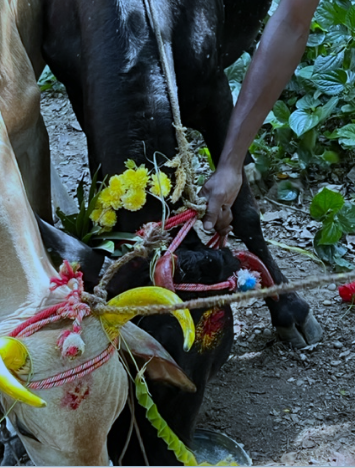 Ce week-end, 15, 16, 17 janvier, c’est Pongal, le nouvel-an tamoul, célébration des récoltes et du renouveau. Les villageois ont lavé leurs rues, dessiné à la poudre des « kollams » (mandala) devant les portes, brûlé leurs vieux vêtements, en ont revêtu de nouveaux…. Une belle fête… qui, comme toujours en Inde, comporte ses violences : les vaches, pourtant sacrées, une fois décorées et honorées, sont pourchassées et effrayées comme divertissement traditionnel…