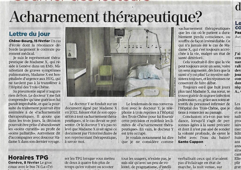 Dans sa rubrique « Opinions » du 18 février 2023, la « Tribune de Genève » publie cette lettre de lecteur signée Santo Cappon. Un cas d’école qui permet à cet auteur prolifique d’infoméduse d’évoquer la survie récente de ma sœur qui, en milieu hospitalier, a failli être la victime d’un médecin ne pouvant imaginer la voir guérir.