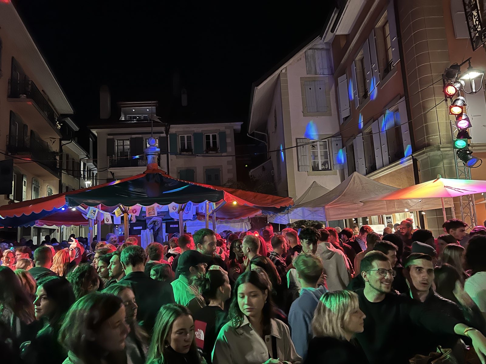 Scène de rue nocturne animée à la Fête des Vendanges de Lutry où les caveaux de la bourgade du Lavaux sont restés ouverts jusqu’au bout de la nuit du samedi 23 au dimanche 24 septembre. Un apéritif prolongé bienvenu dans l’attente du traditionnel cortège des écoliers dimanche. L’édition 2023 honore les 75 ans de la manifestation. Photo Pille