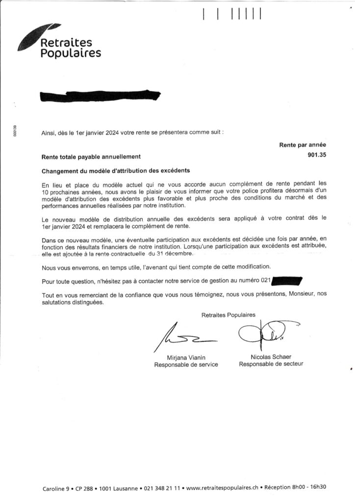 La même missive précise qu’un nouveau modèle de distribution des excédents remplacera le complément de rente. « Une éventuelle participation aux excédents est décidée une fois par année, en fonction des résultats financiers de notre institution ». Mais il s’agit d’une musique d’avenir bien aléatoire, et qui fait une belle jambe à l’heure des augmentations de primes des assurances et du renchérissement du coût de la vie. En l’état, c’est bien d’une réduction de la rente de près de 30% dont pâtit le retraité.