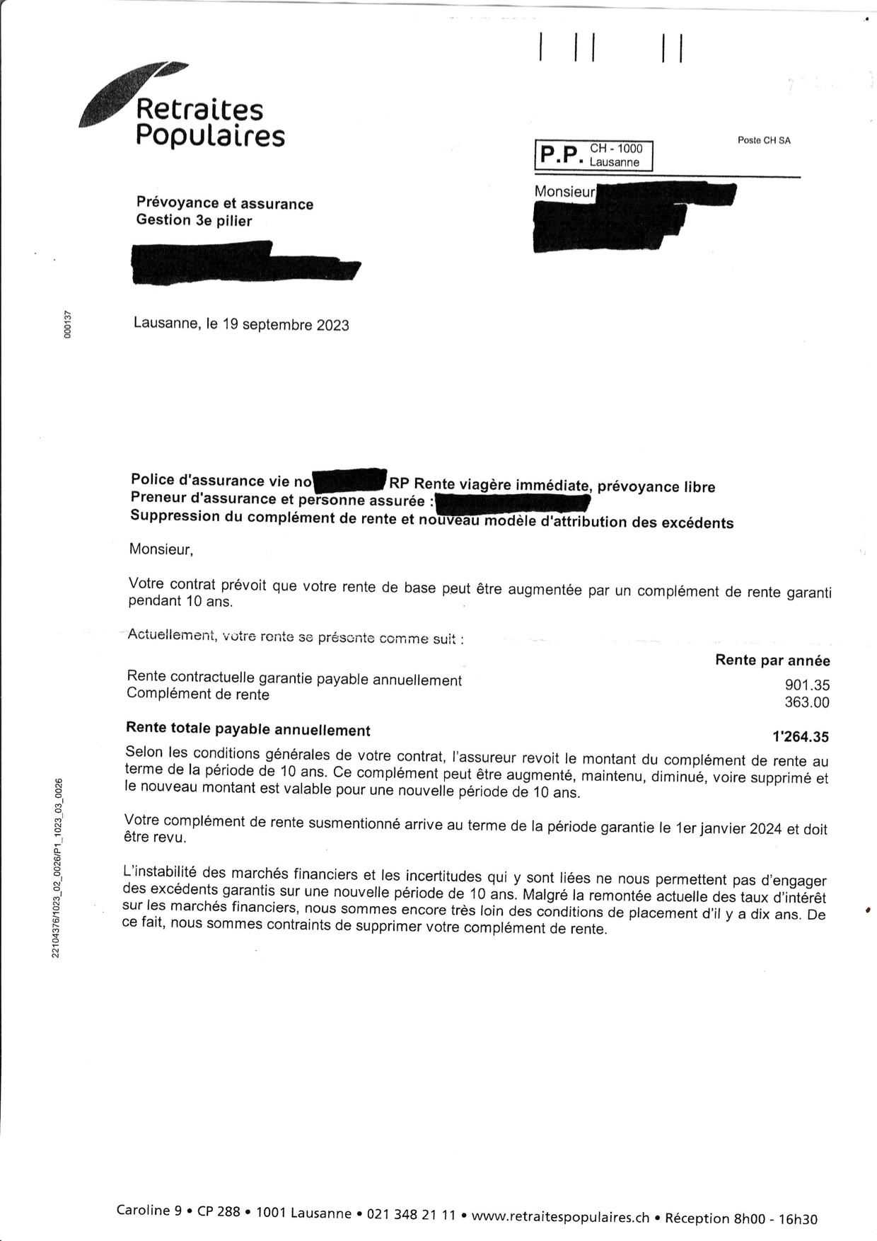 «Bien vivre sa retraite » est le slogan affiché sur leur site internet par les Retraites populaires. Ce que la publicité ne dit pas, c’est que de nombreux retraités vivront moins bien leurs vieux jours à compter du 1er janvier 2024. En tout cas ceux au bénéfice d’une rente complémentaire, une prestation du groupe de rentes viagères vaudois, au conseil duquel siège le ténor socialiste Pierre-Yves Maillard. Une lettre qui a été envoyée à l’un d’entre eux en septembre dernier annonce la suppression du complément de rente. Sur une rente totale annuelle de 1264 francs, la réduction est bien de 363 francs!