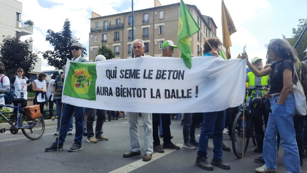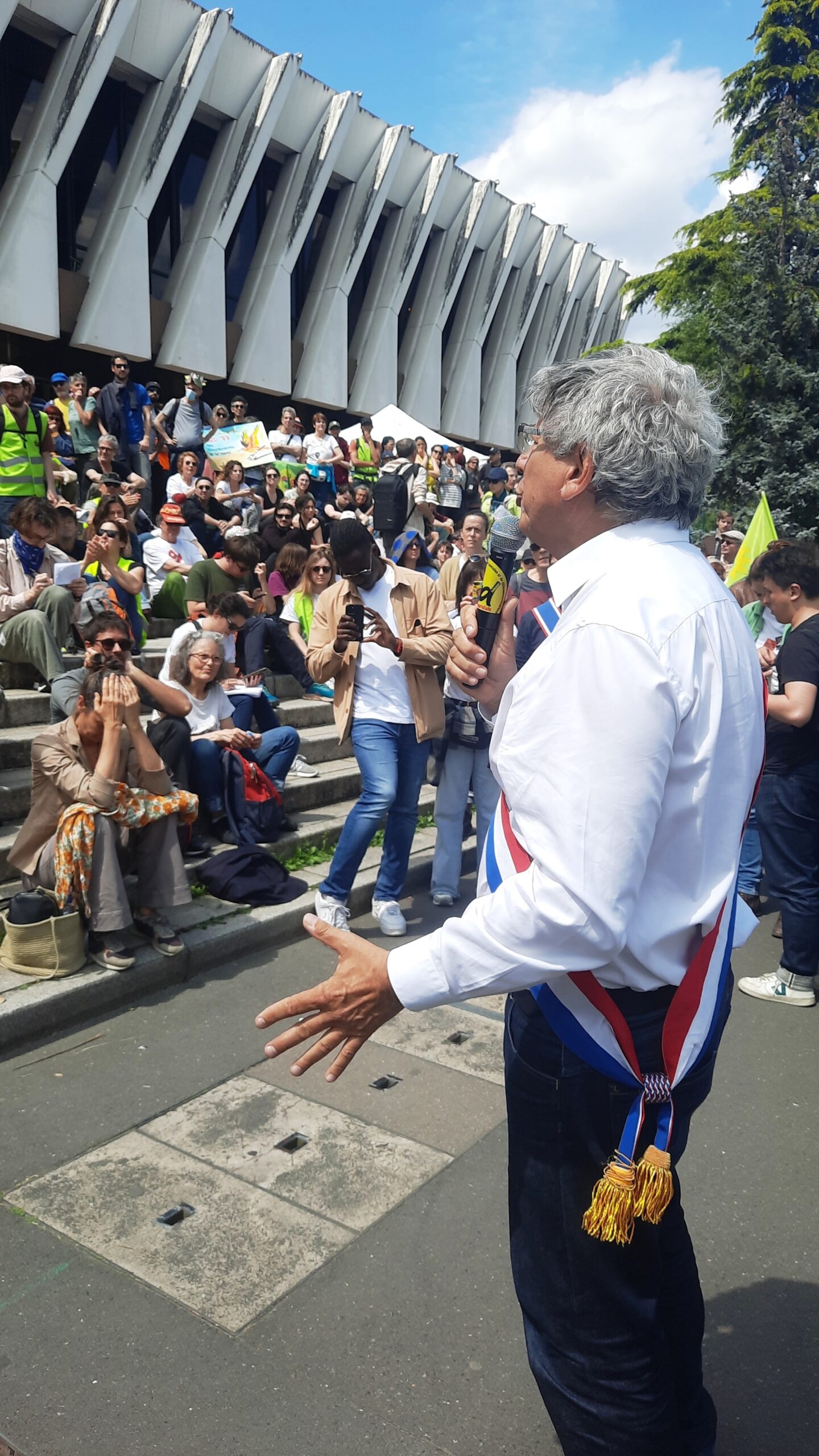 Une bombe oratoire – Ainsi, la France insoumise (LFI) et Europe Ecologie-les Verts se sont joints à la constellation de collectifs et mouvements (Soulèvements de la Terre, Extinction-Rébellion, etc.) qui lors du dernier week-end de mai ont investi les marches de l’escalier à l’entrée de l’impressionnante et austère tour de la mairie de Gennevilliers. Avant d’entreprendre une pérégrination à destination de l’Ile Saint Denis, où se situe la réserve ornithologique, des centaines de militants ont écouté les discours plutôt alarmistes de personnalités politiques et chefs de file de l’écologie, notamment Marine Tondelier et Eric Coquerel.