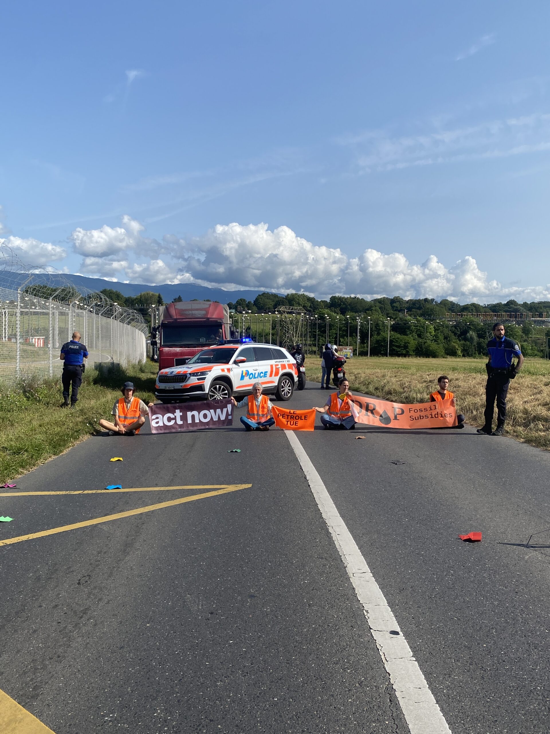 Mercredi 24 juillet 2024, à 10 heures, 6 personnes rattachées au mouvement act now! se sont mobilisées sur la route de Colovrex et l’intersection du chemin des Clys, de l’autre côté du grillage du tarmac de l’aéroport de Genève. Cette action s’inscrivait dans une mobilisation nationale et internationale de différentes organisations climatiques, demandant à leurs gouvernements de signer un traité de non-prolifération des énergies fossiles lancé par certains Etats du Pacifique.