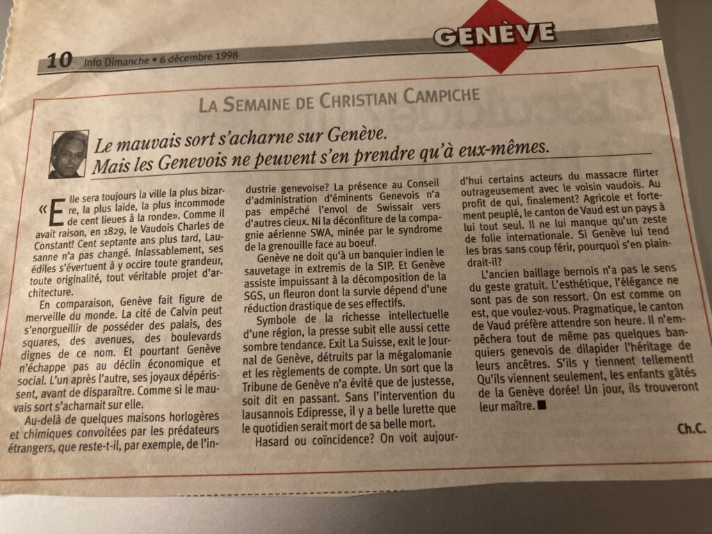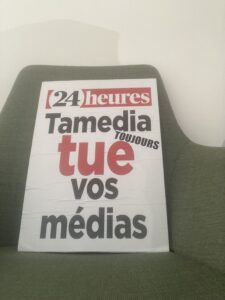 Le groupe zurichois qui contrôle la moitié de la presse romande entend désormais axer sa stratégie d' »attaque » à partir du logo « 24 Heures ». Entendez: créer un seul titre, de Fribourg à Genève, imprimé à Berne! Ainsi se réaliserait la prédiction parue le 6 décembre 1998 dans l’hebdomadaire « Info Dimanche », sous la plume du soussigné: « Exit La Suisse, exit le Journal de Genève, détruits par la mégalomanie et les règlements de compte. Une sort que la Tribune de Genève n’a évité de justesse, soit dit en passant. Sans l’intervention du lausannois Edipresse, il y a belle lurette que le quotidien serait mort de sa belle mort. » Comble d’ironie, ladite TG avait été jusqu’à censurer en 2010 le livre « info popcorn » cosigné par votre serviteur et dont un chapitre portait ce titre: « La presse romande assassinée ».