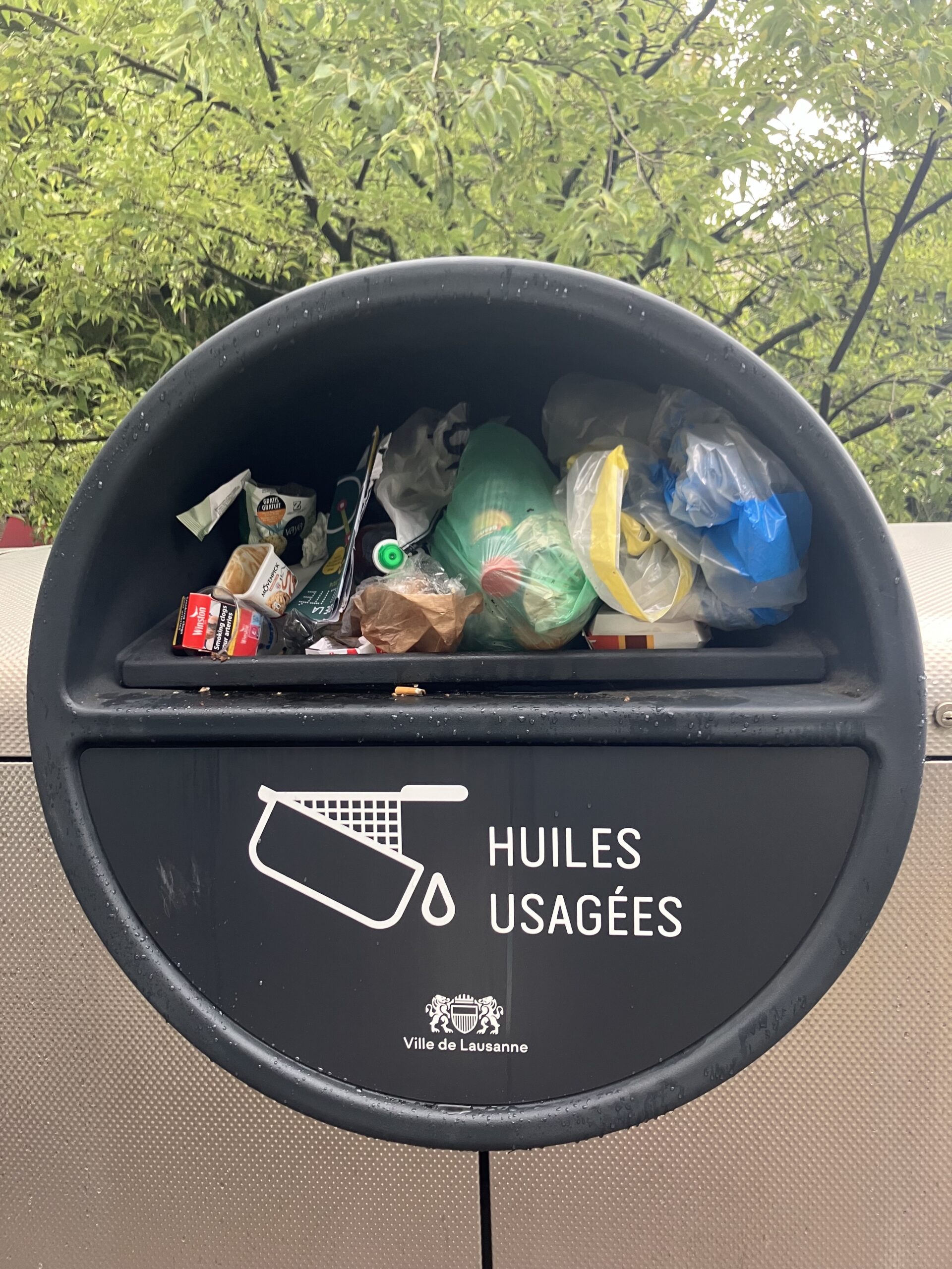 « Ecopoint » lausannois, des canettes, de l’alu, des plastiques, tout sauf de l’huile usagée. A-la-va-comme-je-te-pousse ou le triomphe de l’incivilité. Photo micpic.