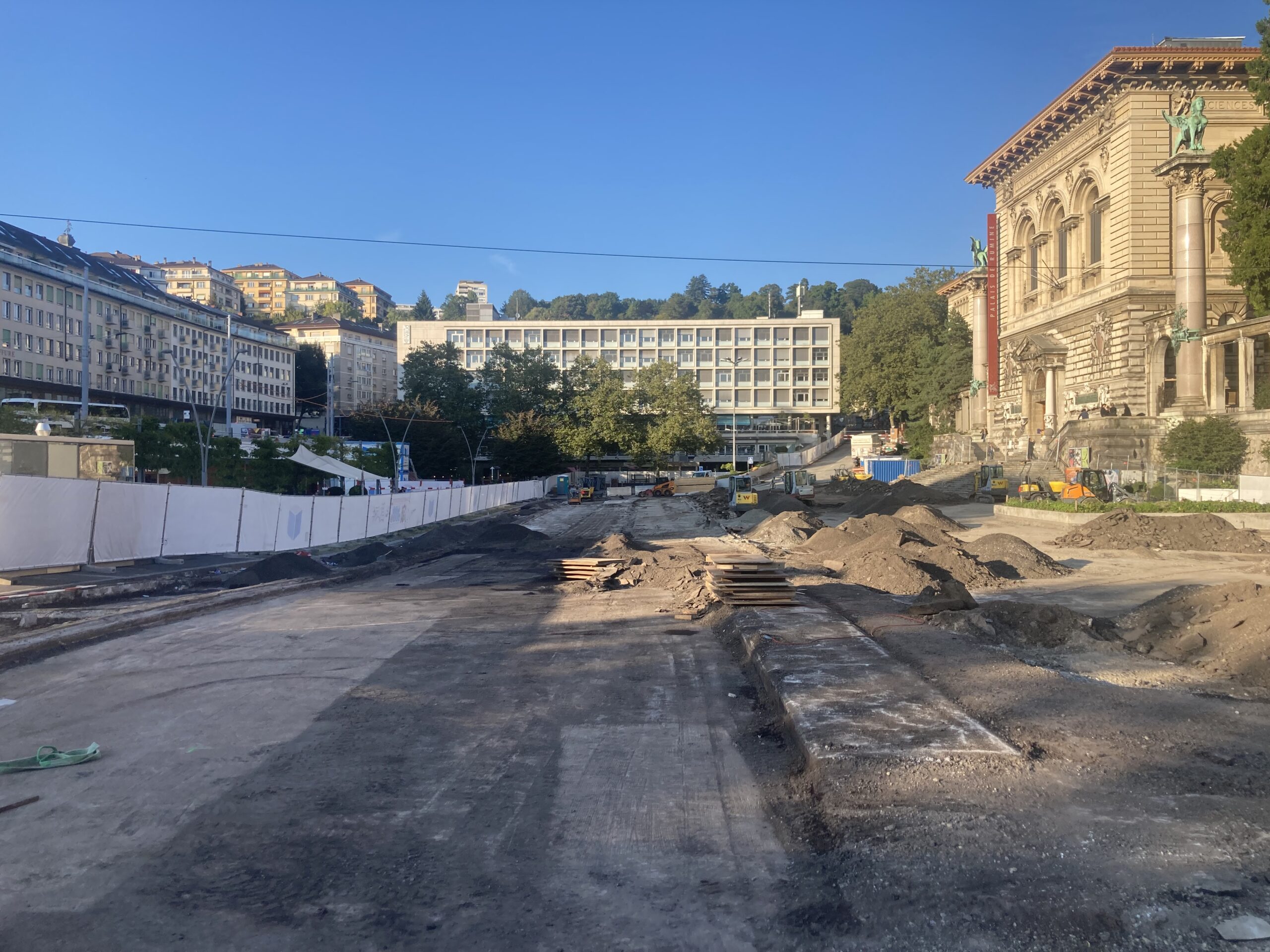 Emplacement stratégique au cœur de Lausanne, la place de la Riponne, au pied du Palais de Rumine, n’est plus qu’un chantier que des palissades soustraient à l’œil du badaud. Mais pour qui a les bras longs… Photo le Médusé.