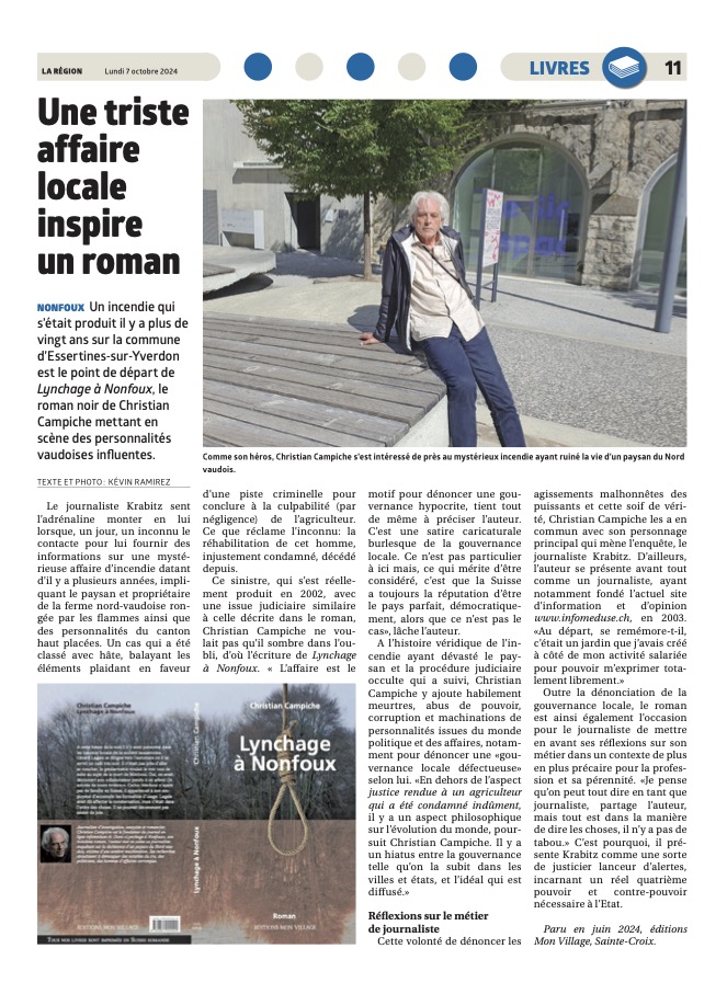 Ce sinistre qui s’est réellement produit en 2002 avec une issue judiciaire similaire à celle décrite dans le roman, Christian Campiche ne voulait pas qu’il sombre dans l’oubli, d’où l’écriture de ce troisième roman, Lynchage à Nonfoux. « L’affaire est le motif pour dénoncer une gouvernance hypocrite, tient tout de même à préciser l’auteur. C’est une satire caricaturale burlesque de la gouvernance locale. Ce n’est pas particulier à ici mais, ce qui mérite d’être considéré, c’est que la Suisse a toujours la réputation d’être le pays parfait, démocratiquement, alors que ce n’est pas le cas. »