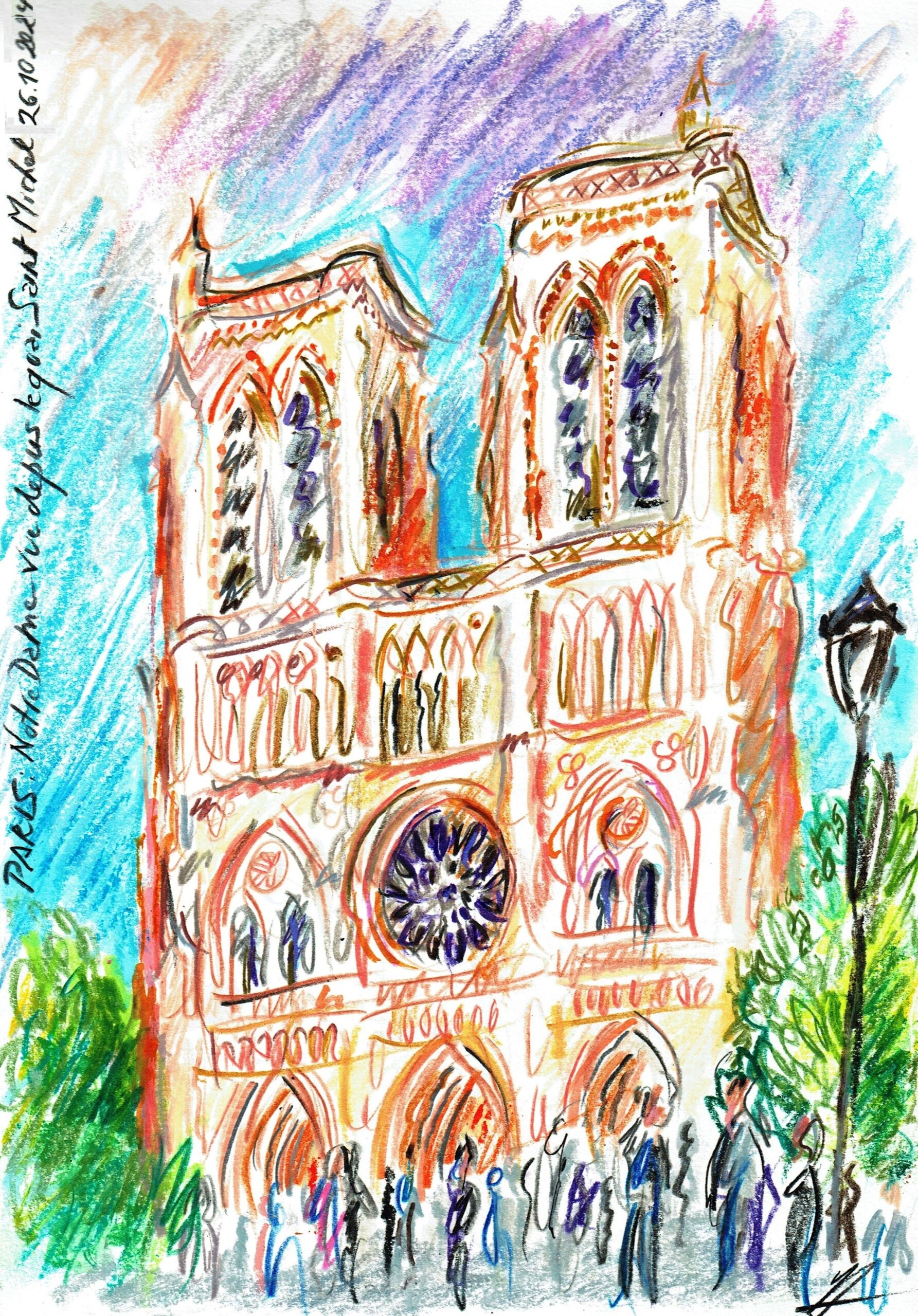 J’eus l’idée de croquer la façade de la cathédrale accoudé à un muret le long du Quai Saint-Michel, à quelques mètres d’un bouquiniste. Ce point de vue privilégié sur Notre Dame présentait l’avantage d’inclure dans le dessin une partie du Petit Pont. En principe, je dessine presque toujours en compagnie de quelques cartons verts sur lesquels sont apposés des dessins (format A4, portrait) au cas où des inconnus seraient désireux d’en acheter pour le moins un.