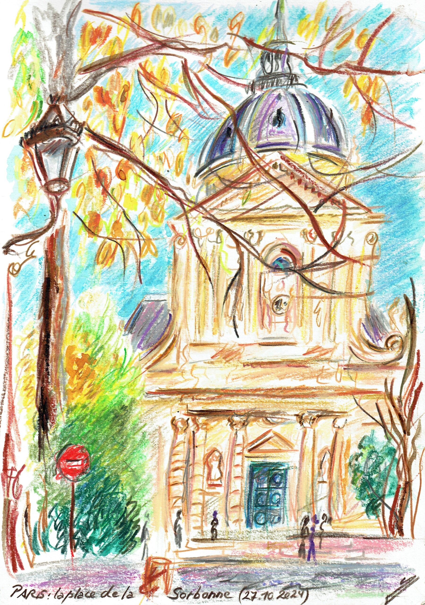 Un dernier petit dessin avant que l’hiver n’expulse des rues les artistes? C’est sur la place de la Sorbonne que j’ai fait une halte récréative et créatrice à une heure avancée de l’après-midi. Un bel endroit, une église reconstruite au 17ème siècle sous l’impulsion du cardinal Richelieu veille sur les badauds comme sur les consommateurs attablés aux terrasses de bars qui n’en finissent pas de bavarder. Sa coupole, majestueuse, m’a valu de la part de visiteurs étrangers la question suivante : « C’est bien les Invalides ? »