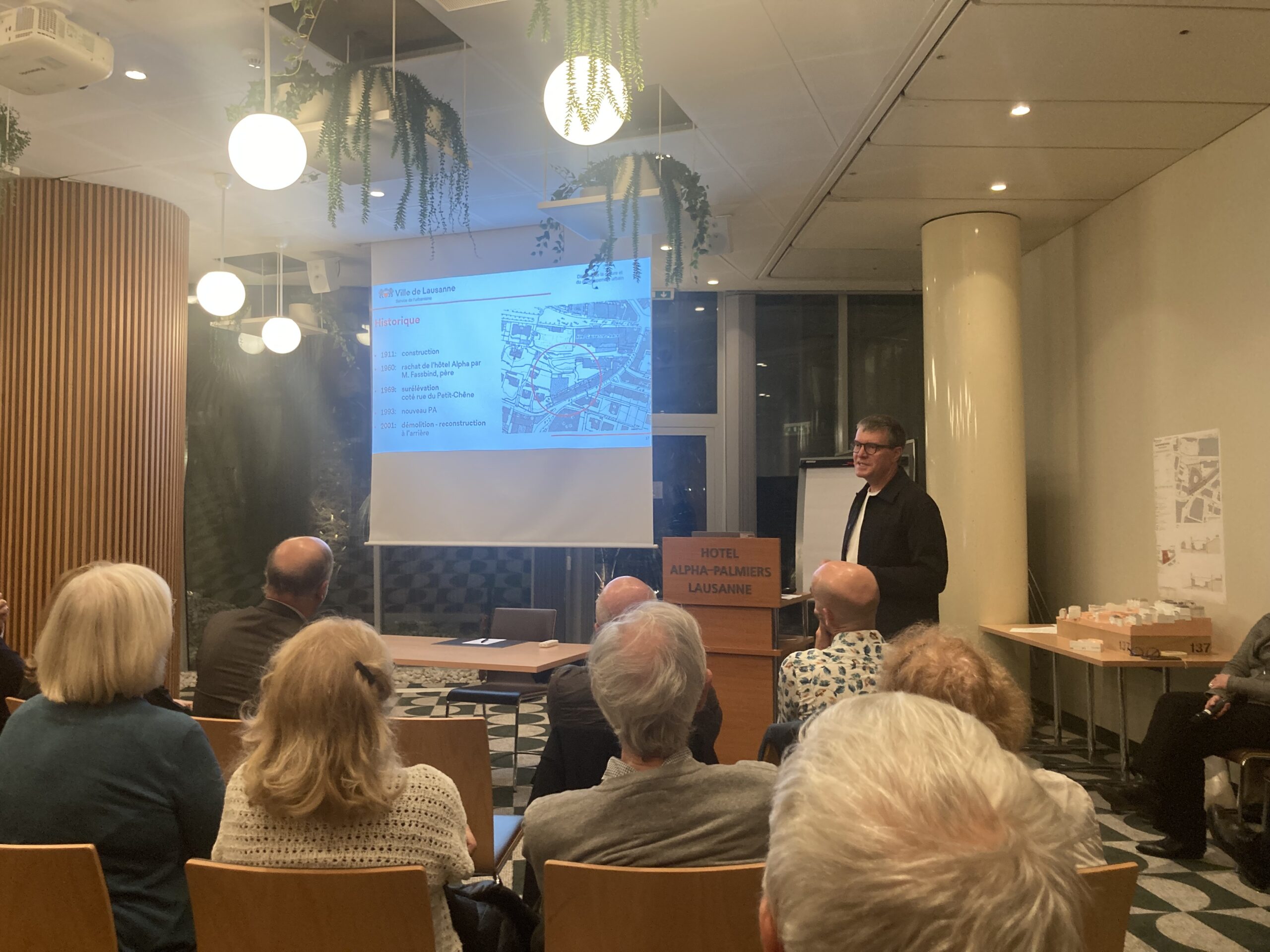 Soirée d’information publique en présence du syndic Grégoire Junod à l’Hôtel Alpha-Palmiers, jeudi 31 octobre, à Lausanne. Le propriétaire de l’établissement 4 étoiles, Eric Fassbind, a dévoilé le projet de nouveau plan d’affectation prévoyant notamment une surélévation du bâtiment sis à la rue du Petit-Chêne, non loin de la gare CFF. Il est prévu qu’une trentaine de chambres seront ajoutées aux 215 existantes.