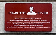 Médecin lausannoise d’origine prussienne Charlotte Olivier-von Mayer (1864-1945) fut une pionnière de la lutte contre la tuberculose. Une plaque posée sur la façade du bâtiment de la policlinique, à l’actuelle rue César-Roux à Lausanne lui rend hommage.