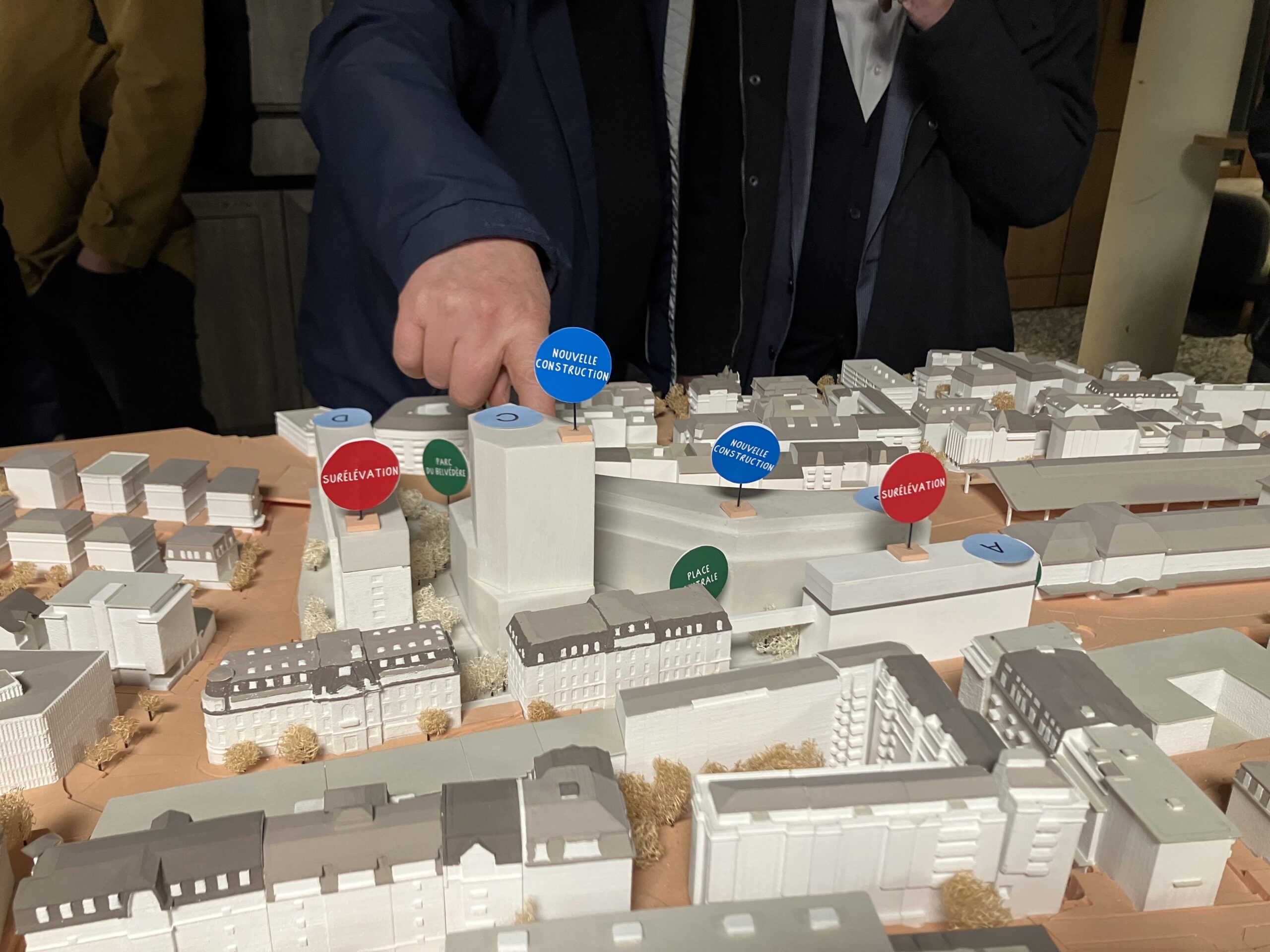 Maquette du quartier de Rasude (photo infoméduse), tel que le conçoivent les promoteurs d’un projet de gratte-ciel non loin de la gare de Lausanne. Dans un hôtel du centre-ville, ce lundi 17 novembre, le syndic Junod avait mis ses plus beaux baskets pour annoncer à la population le démarrage de la mise à l’enquête publique. Absente de la réunion, la presse locale n’en a pas fait état, mais les remarques critiques ont fusé. Une habitante du quartier commente à l’attention d’infoméduse: