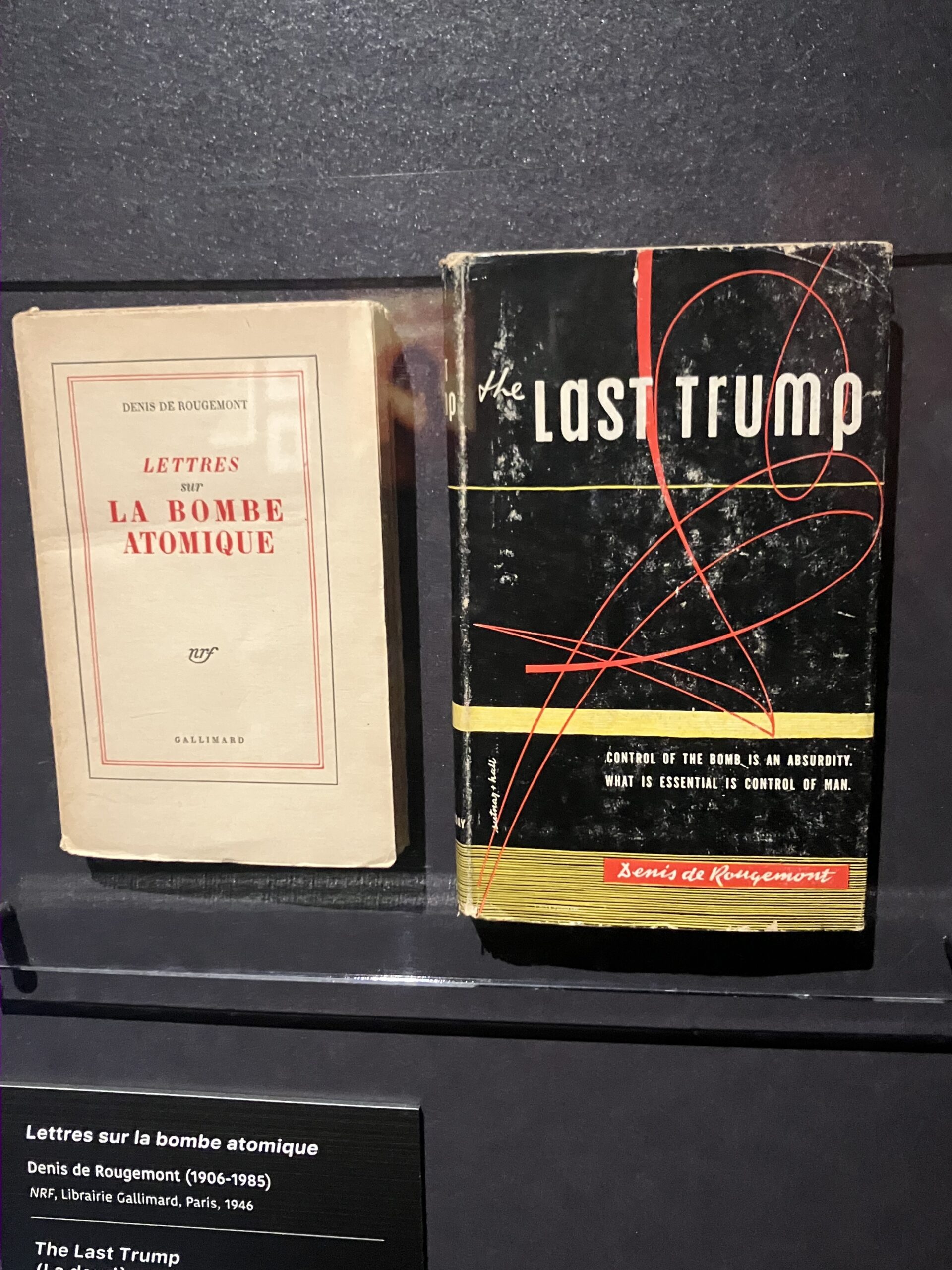 Organisée par le Musée de la Réforme à Genève, l’exposition Apocalypses, qu’avez-vous vu à Hiroshima exhume le recueil de Denis de Rougemont Lettres sur la Bombe atomique (Gallimard, 1946), dont est tiré cet extrait. Visez un peu sur la photo le titre de la version en anglais! Illustrée par le peintre chilien Matta, elle fut éditée peu après chez Brentano’s à New York. Prémonitoire?