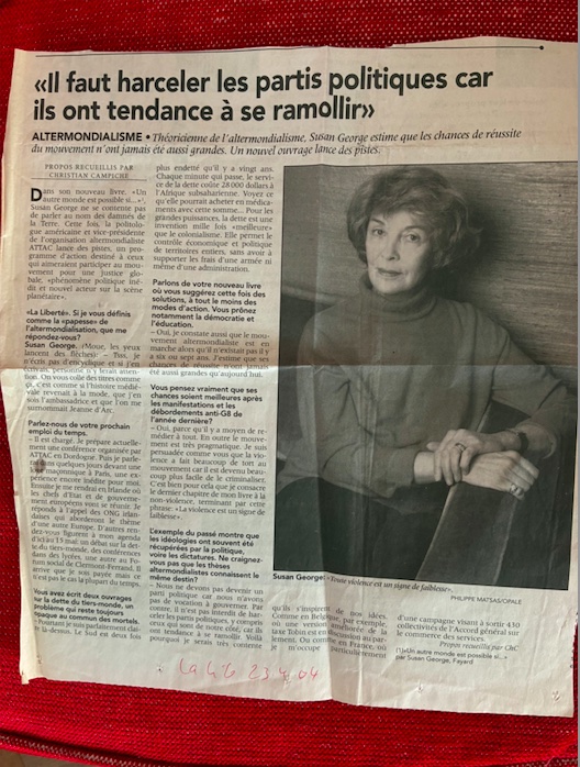 Susan George venait de publier chez Fayard son livre-phare « Un autre monde est possible ». Il suivait d’autres essais très remarqués, dont « Le Rapport Lugano », et précédait « Nous, peuples d’Europe », écrit en 2005 après le « non » des Français et des Néerlandais au référendum sur un traité européen. L’auteure réfléchissait aux conséquences de ce refus de manière constructive, y voyant une chance pour le Vieux Continent de stopper son déclin, dans la mesure où il s’affranchirait du modèle concurrentiel américain en valorisant un modèle social. Extrait: