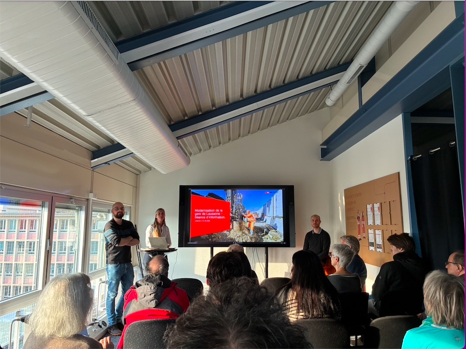 « Café de chantier », 24 mars 2026. Les chefs de projet de CFF Infrastructure présentent aux riverains la deuxième phase du chantier du futur sous-sol de la place de la Gare de Lausanne. Elle débutera en juin 2026, durera environ une année et prévoit de « nombreuses adaptations de circulation, de stationnement et des flux piétons, sans impact sur les arrêts de bus ». La première phase s’est achevée « conformément au planning ». Photo @ infoméduse